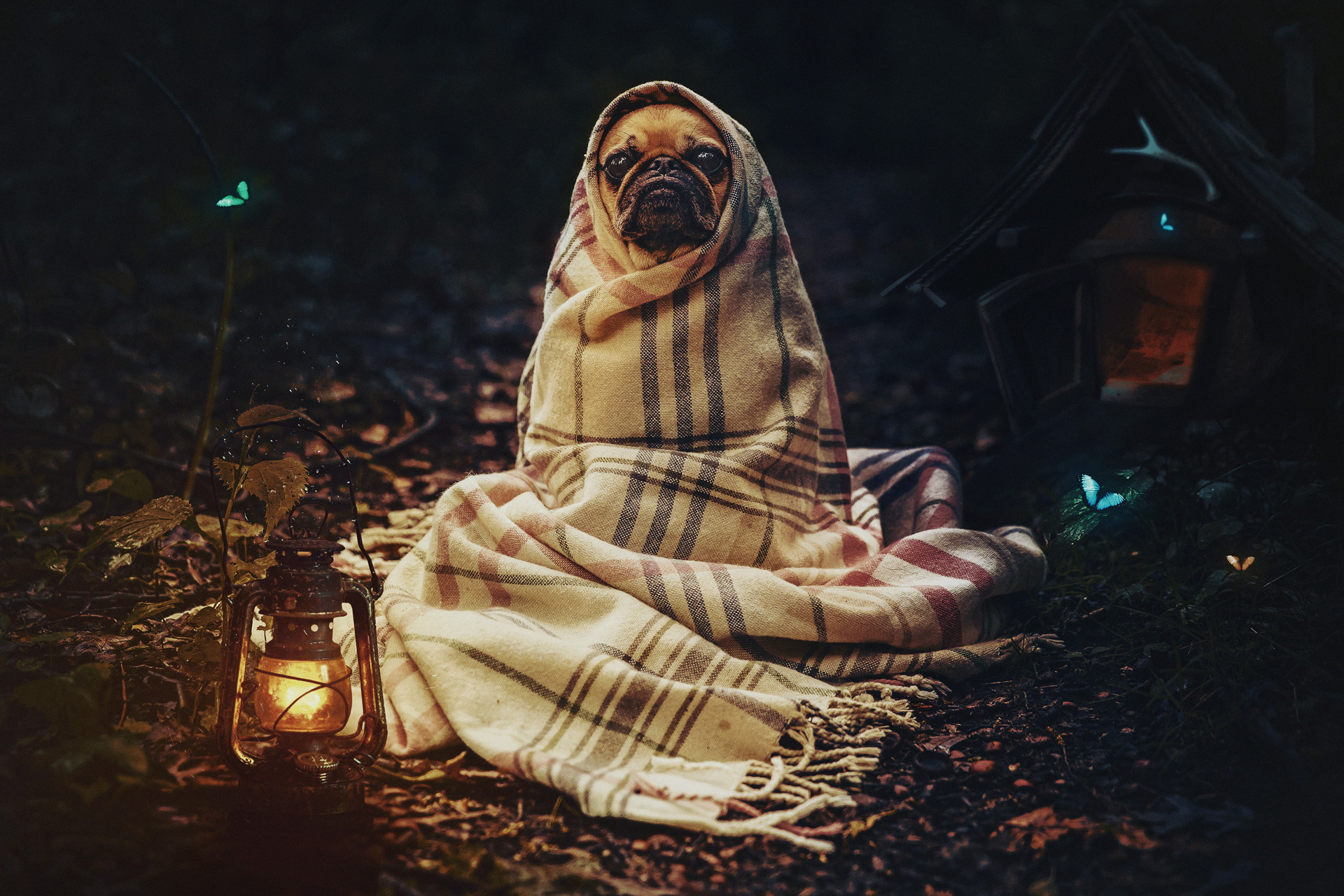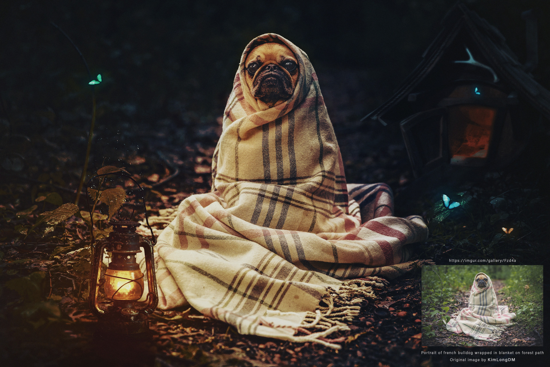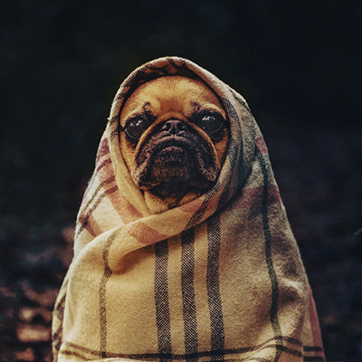 Portrait of french bulldog wrapped in blanket on forest path